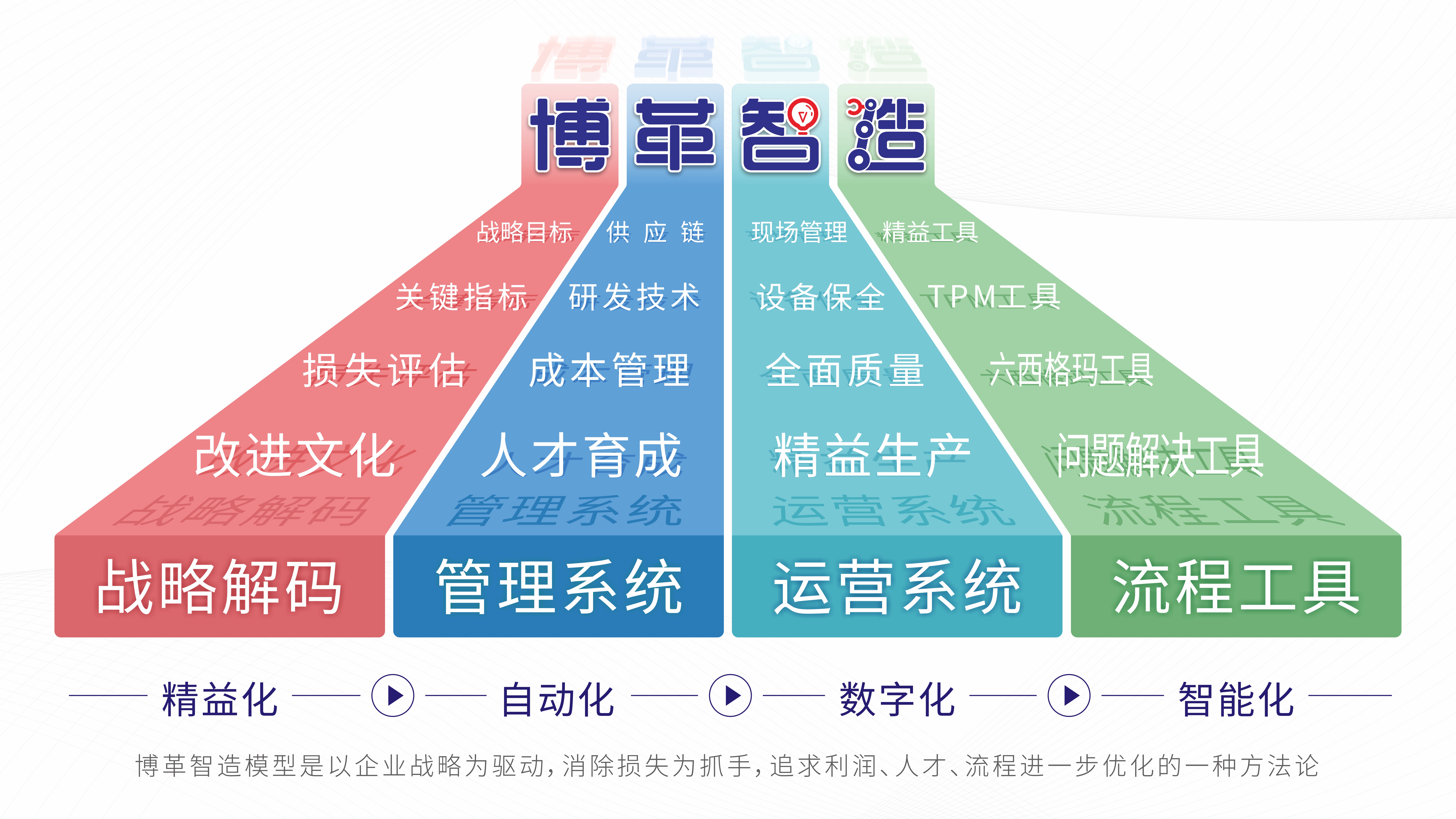博革結合跨行業、多領域豐富的咨詢經驗,并融合國內企業的特點,設計了博革智造的模型,幫助國內1000+企業實現從精益化到自動化、數字化、智能化的跨越轉變,有效為企業提升核心競爭力,實現智能化生產運營系統的搭建及陪跑,助力企業全面實現卓越運營。 博革顧問團隊均來自世界500強企業,如豐田、三星、富士康等,其中多位專家是中國企業聯合會管理咨詢專家、全國六西格瑪推進委員會專家委員;六西格瑪注冊黑帶考試命題專家委員、韓國能率協會、日本能率協會專家。并且博革在全國擁有上百家戰略合作伙伴,其中包含了:自動化、數字化、智能化等各個領域的戰略合作伙伴。