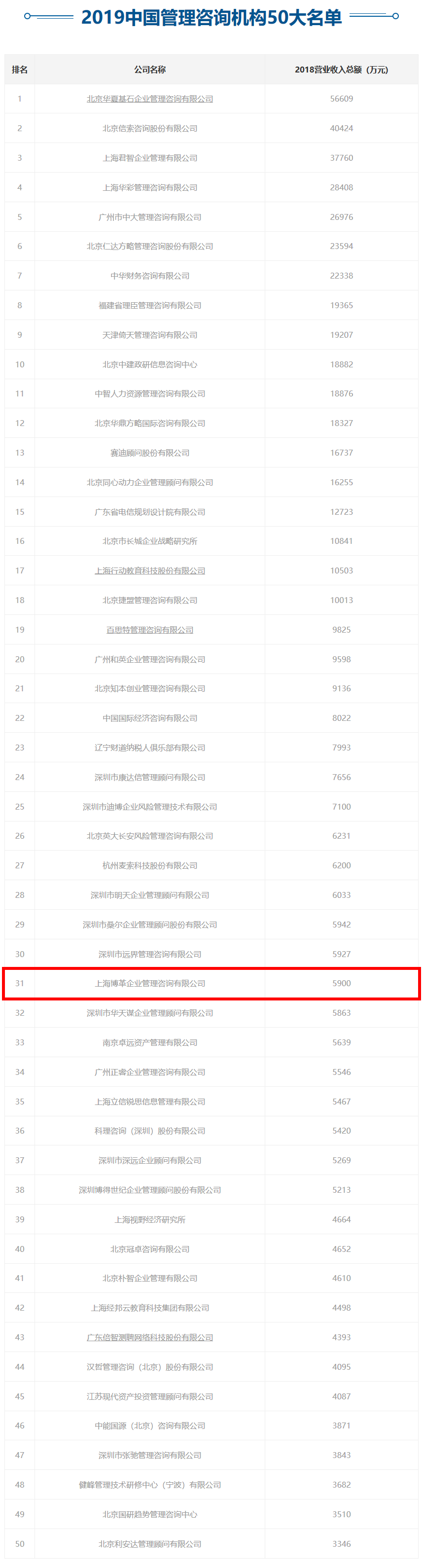 - 【喜訊】博革咨詢榮登“2019中國(guó)管理咨詢機(jī)構(gòu)50大名單”第31位!