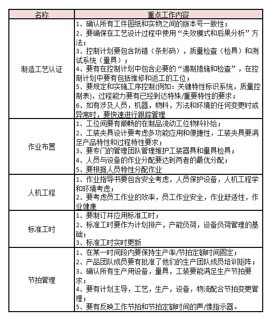 我們比較一下在國內平均水準的民企、國企和外企的現場管控能力,我們會發現人真正出現較大差距的是工藝技術管理能力。就如同同樣是生產一臺產品,但兩家企業的效率差異會巨大,而真正影響他們效率的是都是作業布局、人機工程、工裝夾具等,以至于有些人往往把精益變革與工藝改善看做是一樣的事情。當然在精益變革中所講的卓越工藝模塊不是狹隘的工藝技術改善,它所包含的范圍更廣。 卓越工藝要素工作重點 作者:博革咨詢