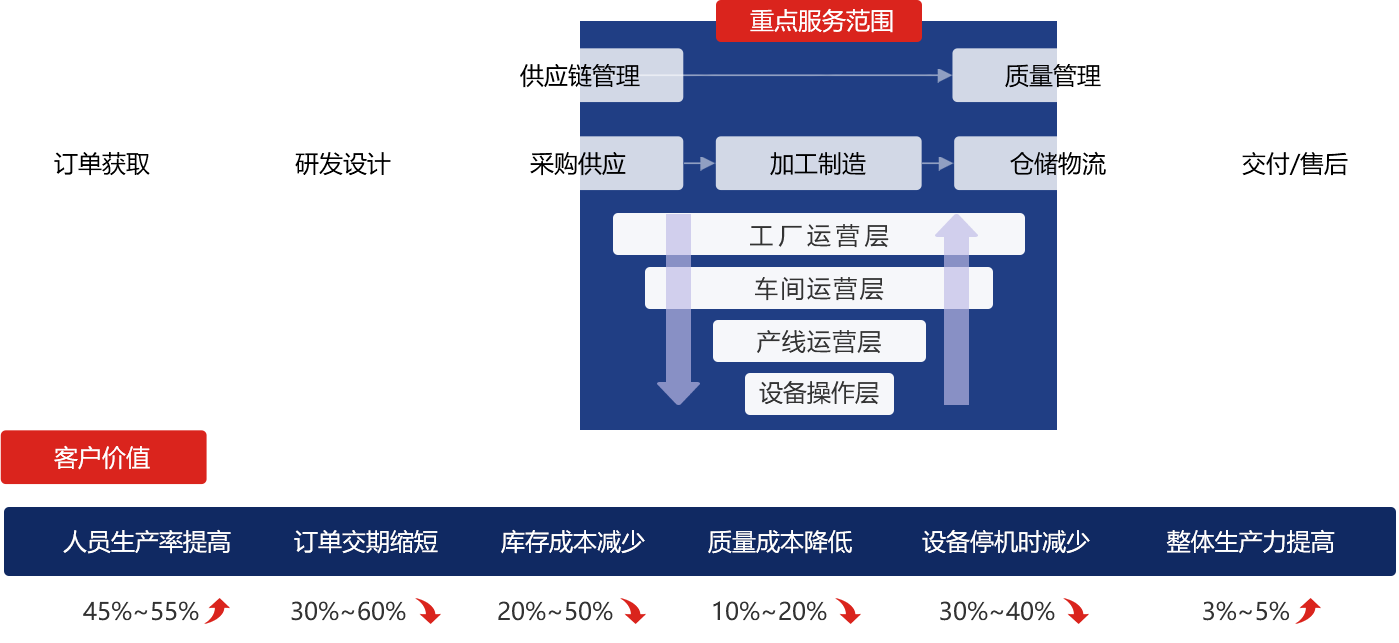 “精益生產咨詢”是建立“設備操作層”到“工廠運營層”的精益生產管理體系,通過設備物聯、電子看板等方式打通工廠內外數據,打造透明化工廠,提升異常事件響應速度,