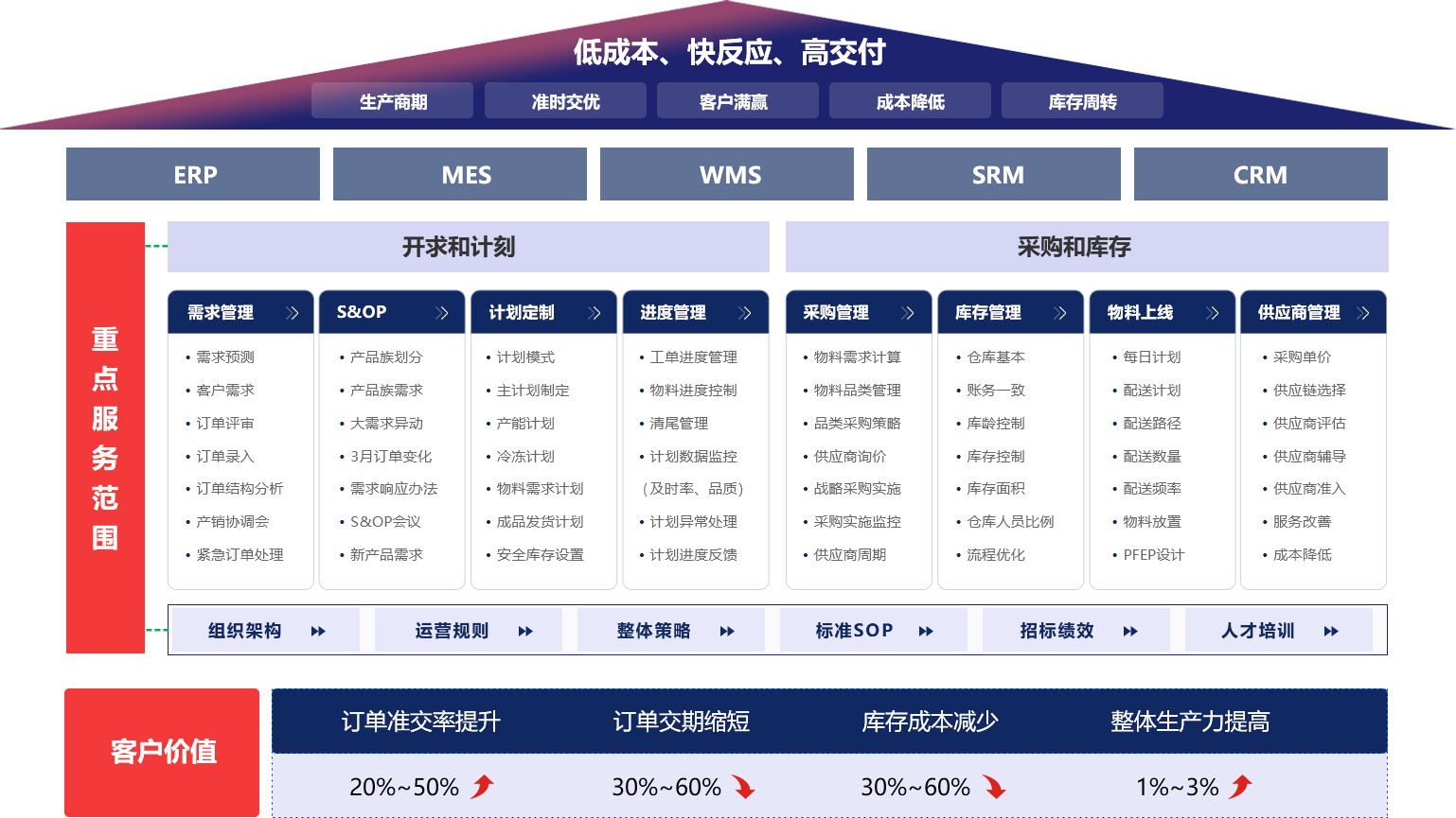 “精益供應鏈咨詢”是打通端到端敏捷供應鏈,從客戶訂單管理,主生產計劃和物料需求計劃,采購訂單管理到供應商庫存和出貨管理協同共享,