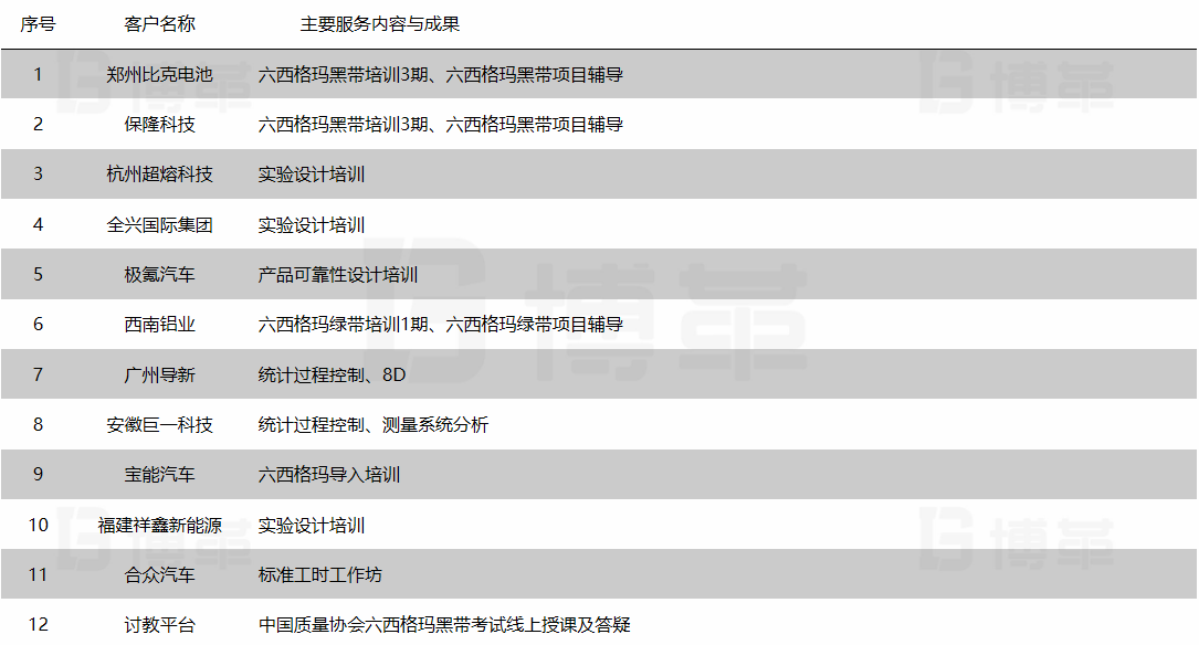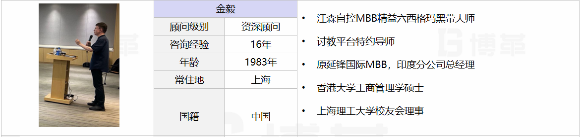 咨詢(xún)能力介紹 20年歐美企業(yè)工作經(jīng)驗(yàn),負(fù)責(zé)眾多 6Sigma項(xiàng)目和其他改善活動(dòng); 培訓(xùn)及輔導(dǎo)企業(yè):極氪汽車(chē)、寶能汽車(chē)、比克電池、保隆科技、全興國(guó)際、巨一動(dòng)力、合眾汽車(chē)、超熔科技等; 成功輔導(dǎo)超過(guò)近百名黑帶和六百多名六西格瑪綠帶。曾為中國(guó)多家知名企業(yè)及國(guó)際化集團(tuán)公司導(dǎo)入近百個(gè)六西格瑪改善項(xiàng)目;累計(jì)為企業(yè)帶來(lái)超過(guò)近千萬(wàn)的改進(jìn)收益;