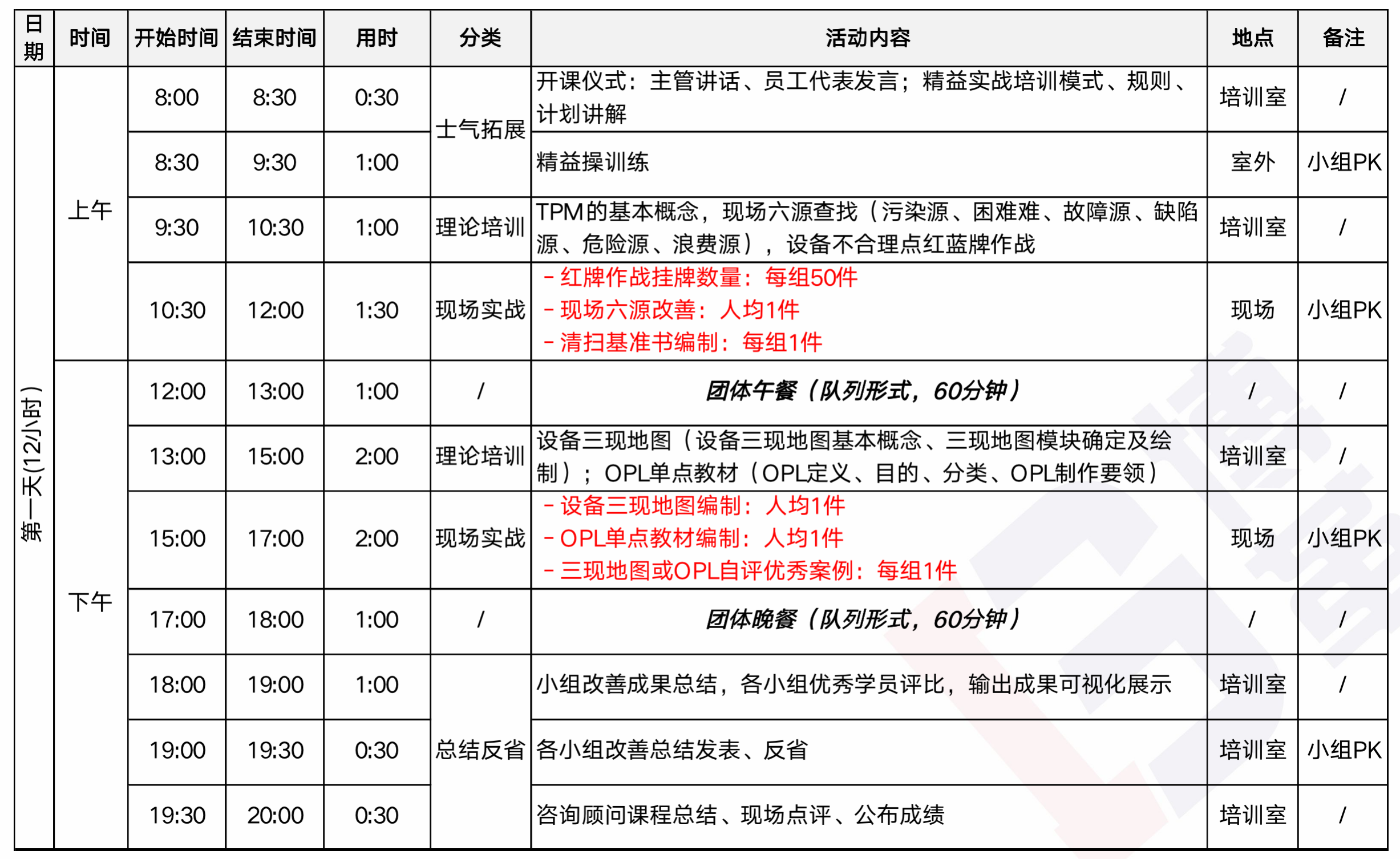 每次培訓(xùn)會(huì)根據(jù)企業(yè)的需求選擇不同的主題,包含但不限于:現(xiàn)場(chǎng)5S、TPM、標(biāo)準(zhǔn)作業(yè)、六源改善、質(zhì)量改善、快速切換、產(chǎn)線平衡、工位布置、浪費(fèi)識(shí)別與改善、QC/IE工具應(yīng)用等