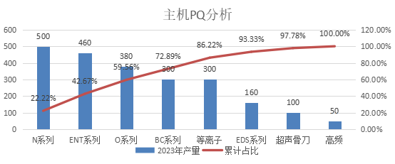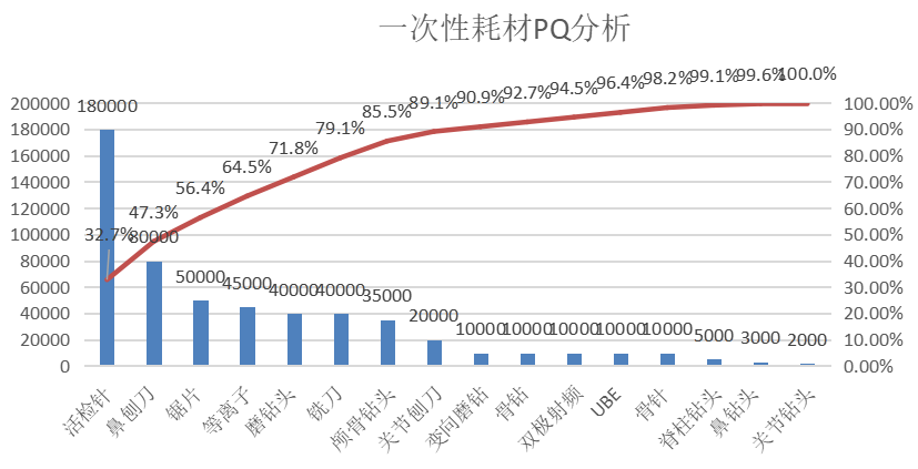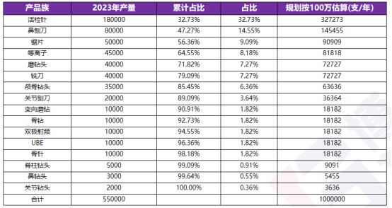 根據(jù)工廠的產(chǎn)品的產(chǎn)品族分析,工廠活檢針類(lèi)產(chǎn)品的銷(xiāo)量占產(chǎn)品的32.7%,為一次性耗材第一,活檢針,鼻刨刀,鋸片,等離子,磨鉆頭,銑刀,顱骨鉆頭量占比總量的85.5%。