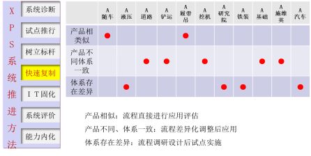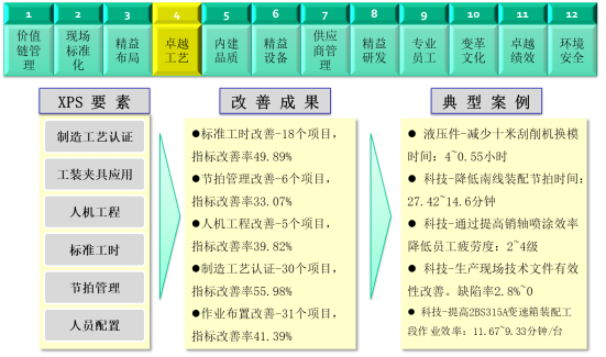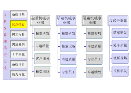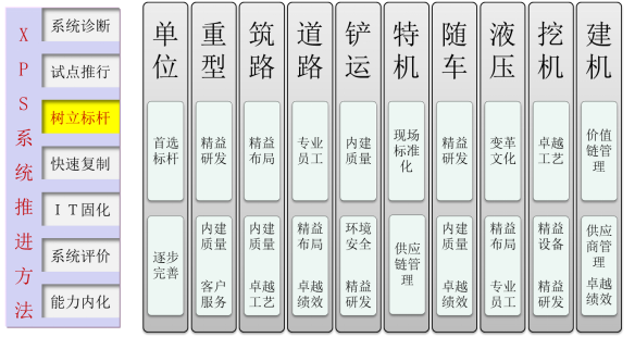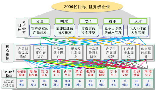 XPS根據A集團及所處行業的特點,在A集團的十二五戰略目標為愿景,制定了世界級企業關注的5大目標,工程機械行業運營中最重要的12大模塊,提煉出58項要素和235項要求。