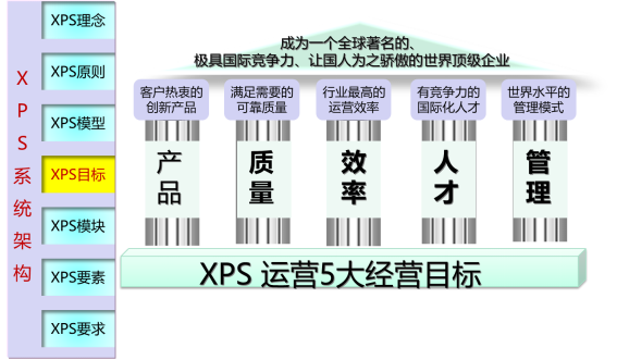 XPS的目標是幫助A成為世界頂級的企業,世界頂級的企業必須能夠提供客戶認可的世界頂級的產品,滿足各種需要的世界頂級的質量,行業最高的運營效率,具有競爭力的國際化人才,以及世界水平的管理運營模式
