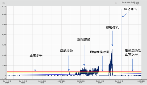 如下圖所示,某機(jī)床通過(guò)振動(dòng)分析,可以看到10月18日振動(dòng)加速度峰值觸發(fā)早期預(yù)警閾值,但是由于生產(chǎn)計(jì)劃問(wèn)題,沒(méi)有停機(jī)維護(hù);10月22日機(jī)床主控系統(tǒng)觸發(fā)故障,不得不停機(jī)過(guò)10個(gè)小時(shí)維修和更換軸承,維修后,振動(dòng)恢復(fù)正常水平,但較大損失已經(jīng)造成。